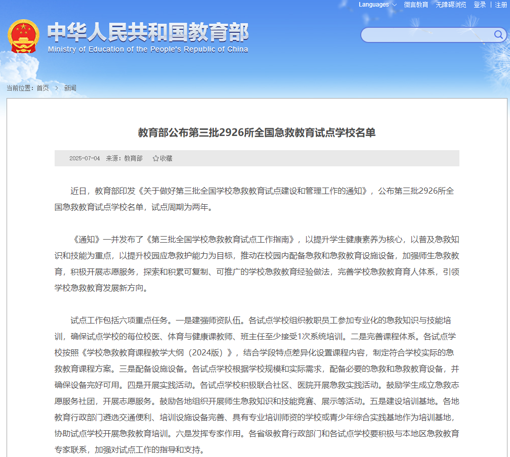 重磅消息|教育部公布第三批2926所全国急救教育试点学校名单